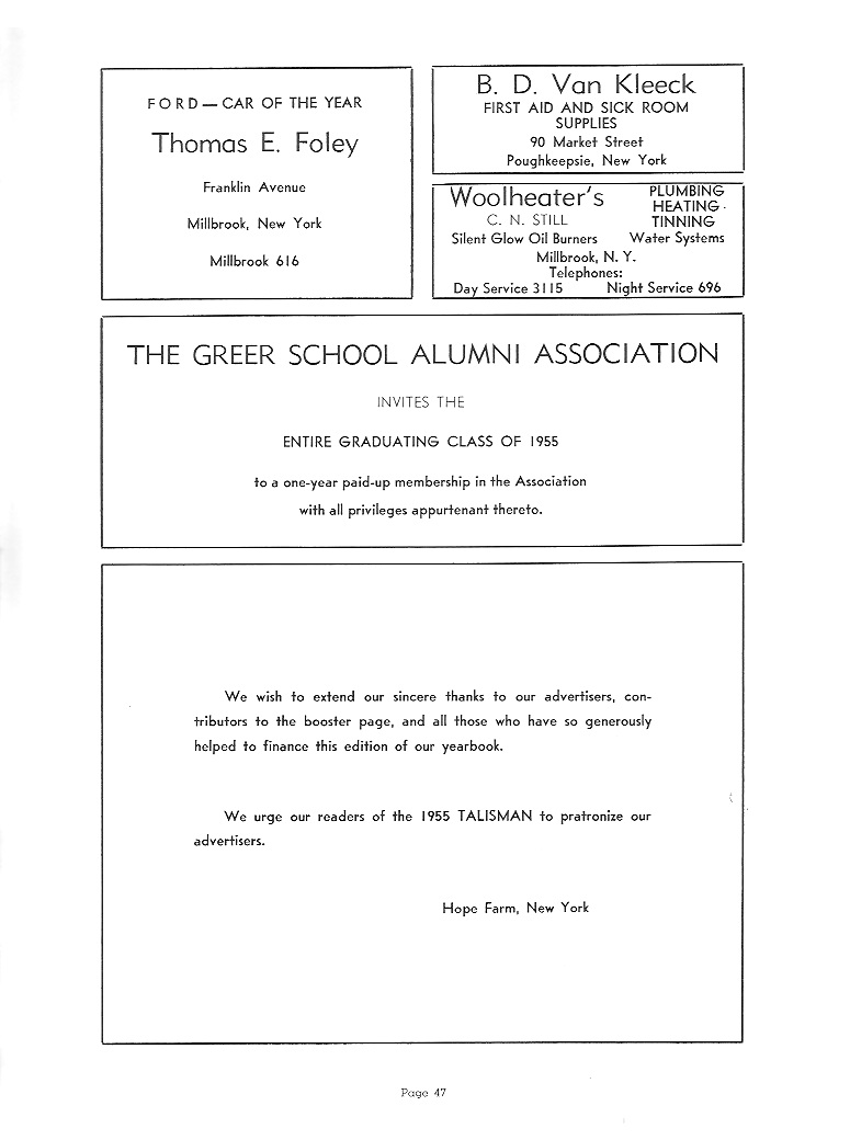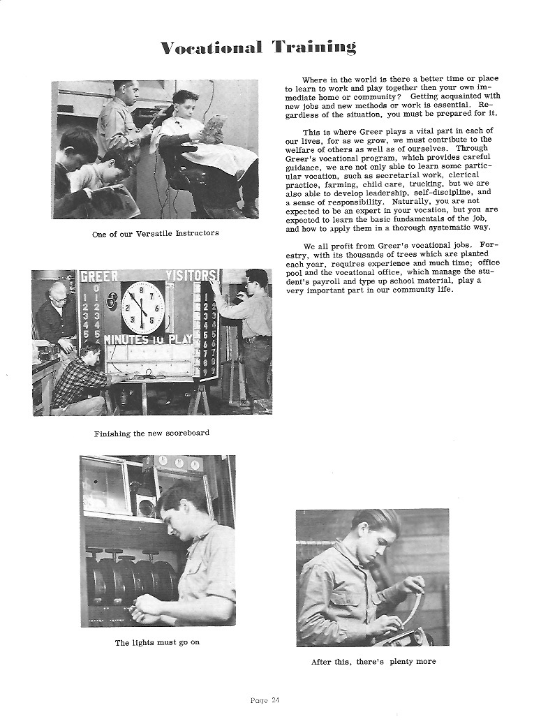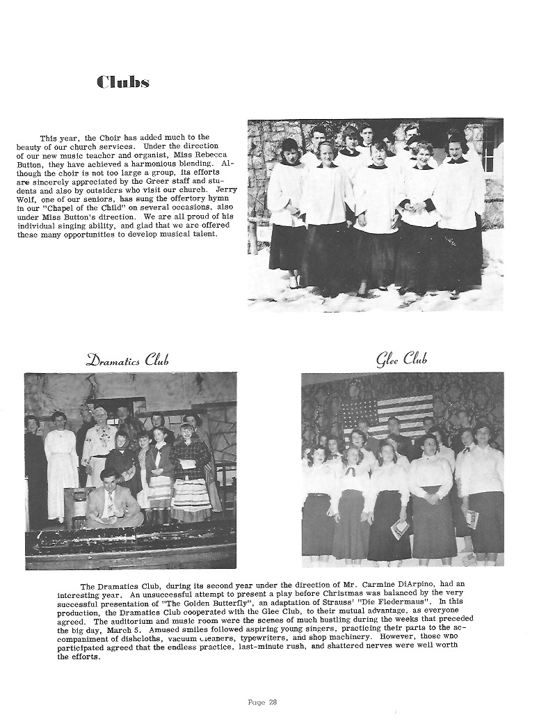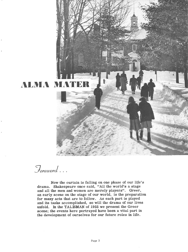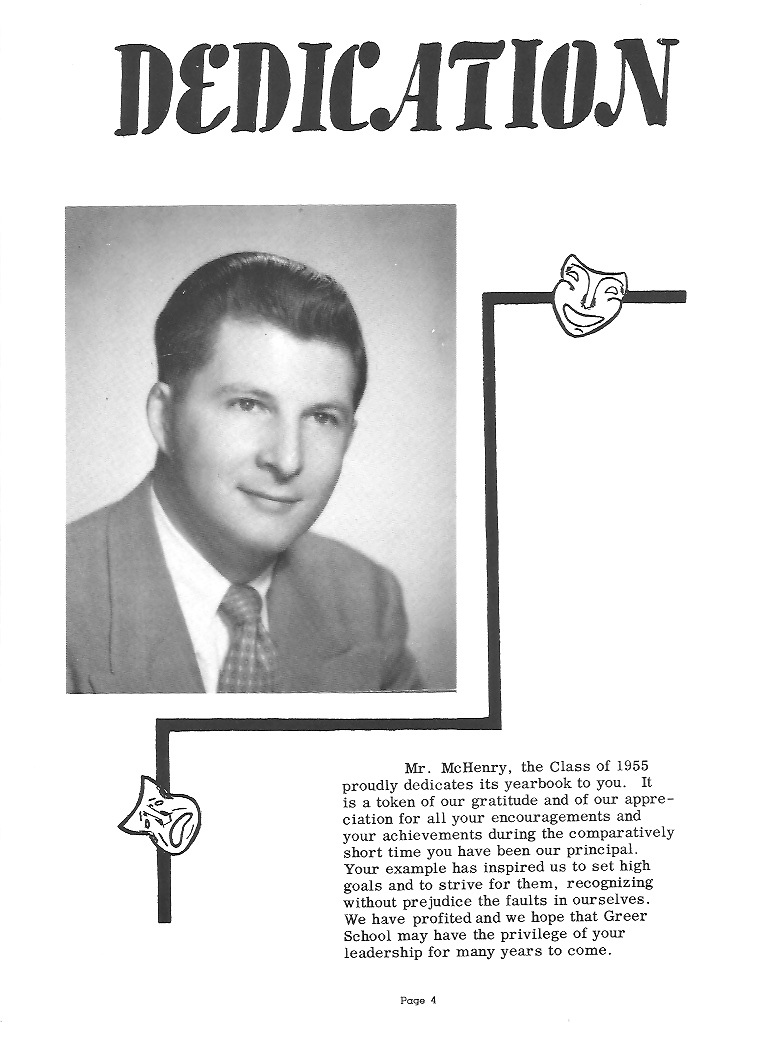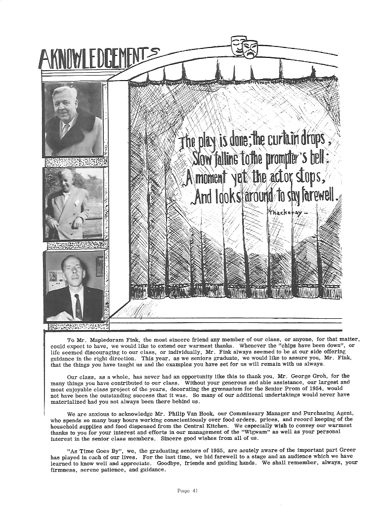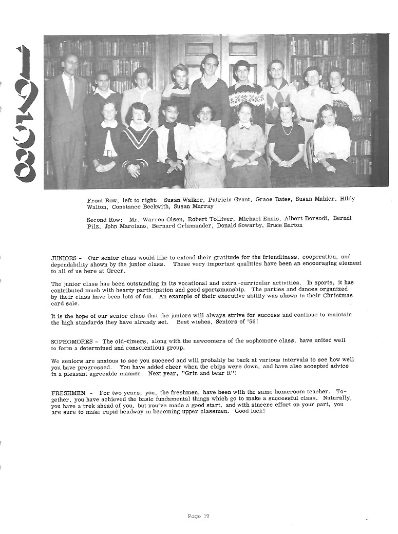 appreciative. Those who have been at Greer for a long time realize the importance of the responsibilities and underwritten courtesies which should belong to the upperclassmen. Naturally, leadership and high standards are expected of the Senior class. We shall in the future try to make ourselves worthy of the trust that you have placed in us, and in our future work when our thoughts turn back to Greer, we shall be constantly encouraged, remembering the foundations you laid for us. To those who are following after us, and assuming the responsibilities and standards we have thus far maintained, we wish to extend our warmest support and hope that they will always hold up the high standards set at Greer. |
