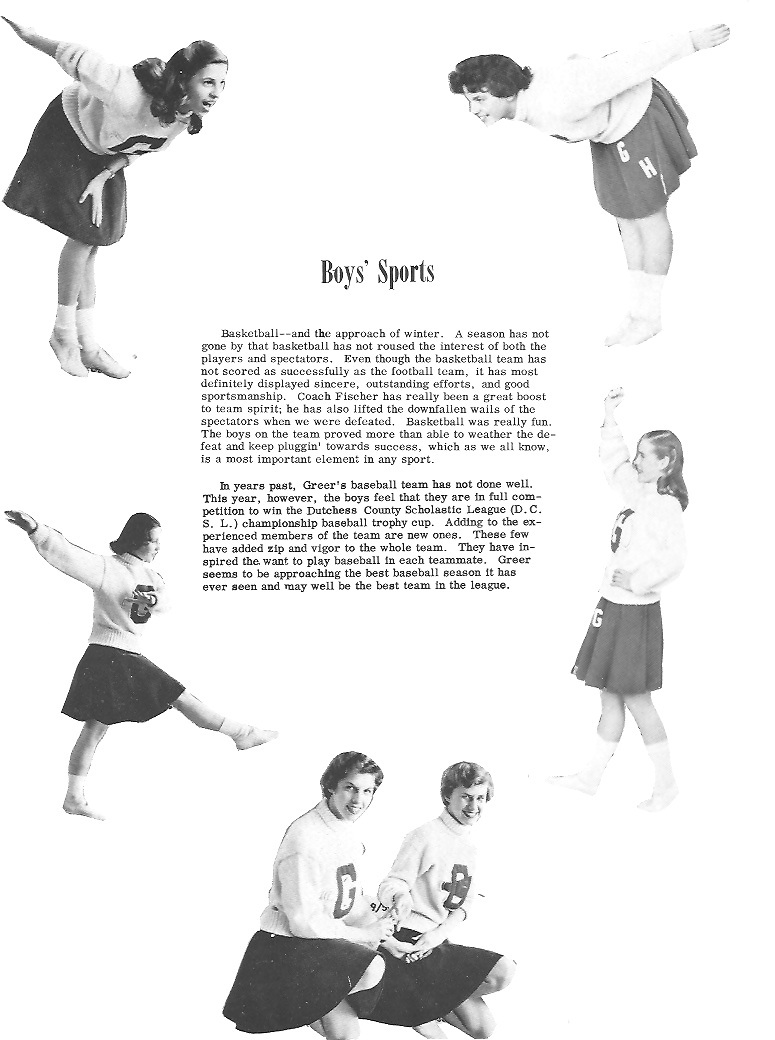 ![]() HELEN THERESA GREENE Born: October 30, 19**; Sharonsprings, New York Entered Greer: January 28, 1954 Amherst High School; Amherst, Massachusetts; 1,2, 3 Dramatics 4; Choir 4 Glee Club 3; Y.P.F. 2, 3, 4 Cheerleading 2 Field Hockey 2; Basketball 1, 2, 3, 4 Volleyball 2, 4; Softball 1, 2, 3, 4 Ambition: Ballet Dancer