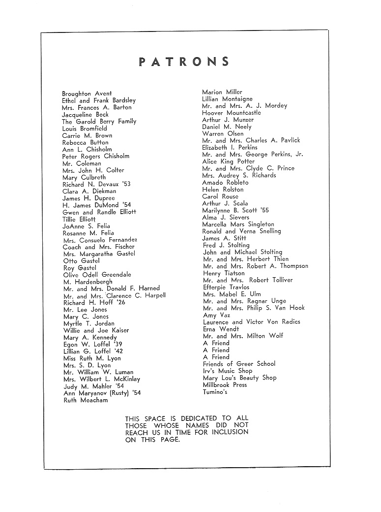 WILLIAM JAMES ELLIOTT Born: January 10, 19**; Sharon, Connecticut Entered Greer: September 7, 1947 Class President 2; Class Vice-President 3 Albrecht Award 2; Herbert Bender Loyalty Award 3 Roelif Brooks Award 2, 3; Florence Rapallo Award 3 Red & White 3; Talisman 4 Martin Play 4 Football, Manager 3, 4 Basketball 1, 2, 3, 4; Baseball 1, 2, 3, 4 Ambition: Accountant ![]() PENNY ANN HARNED Born: December 31, 19**; Brooklyn, New York Entered Greer: October 1, 1952 Erasuus Hall High School; Brooklyn, New York; 1 Class President 4 Red & White 3; Talisman 4 Dramatics 3, 4; Y.P.F. 3 Glee Club 3, 4; Choir 3, 4 Field Hockey 3, 4; Basketball 3, 4 Volleyball 3, 4; Softball 4 G.A.A. 3,4 Ambition: College education Page 11 |