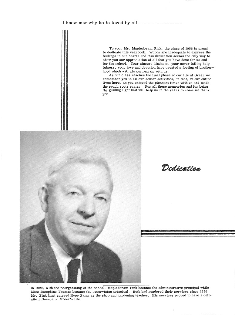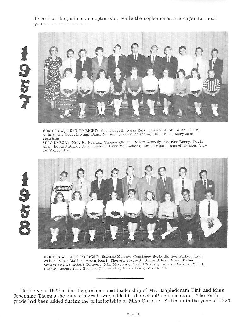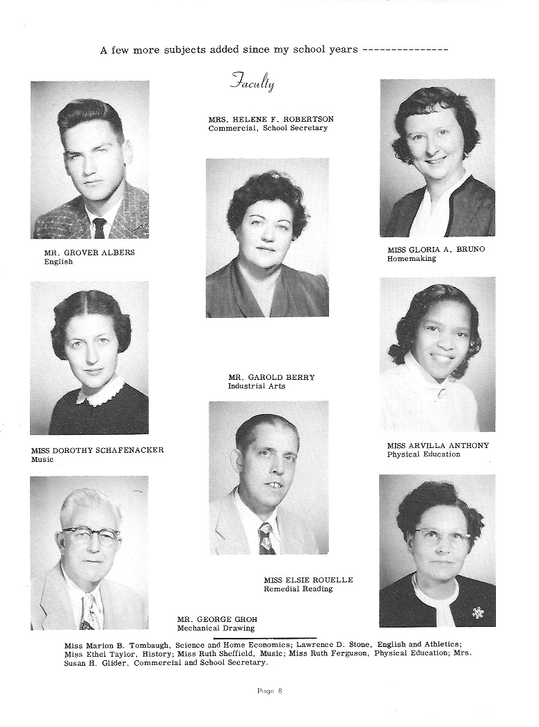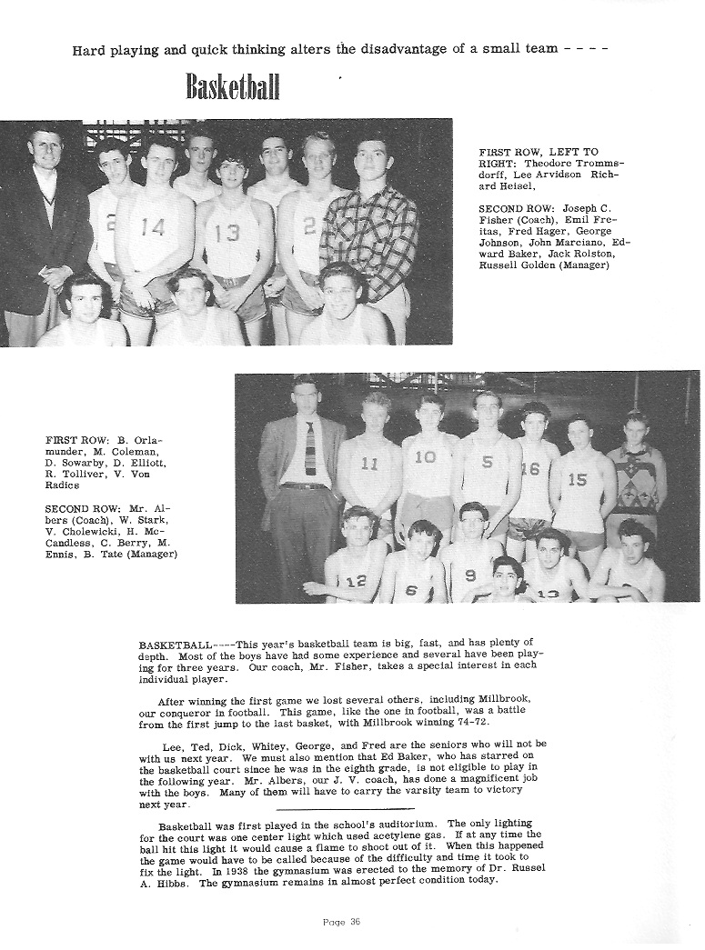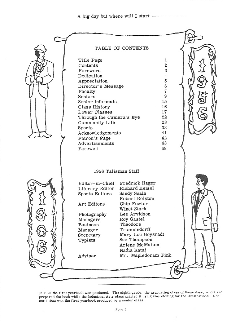 with the 1934 yearbook. The 1956 yearbook is dedicated to Mr. Mapledoram Fink and has an appreciation to Mr. George Groh - the 1934 book had no appreciation but was dedicated to Mr. Frederick Behrends. The 1956 yearbook has pictures of fourteen seniors and a post graduate - the 1934 yearbook had only six senior pictures. (continued) |