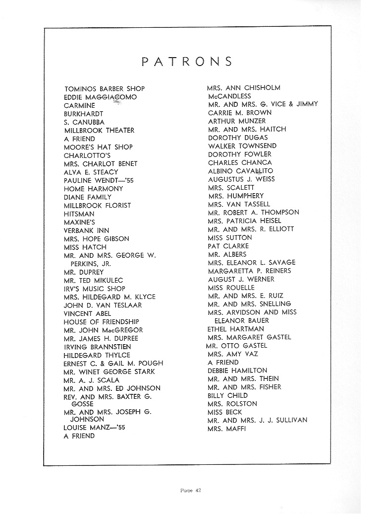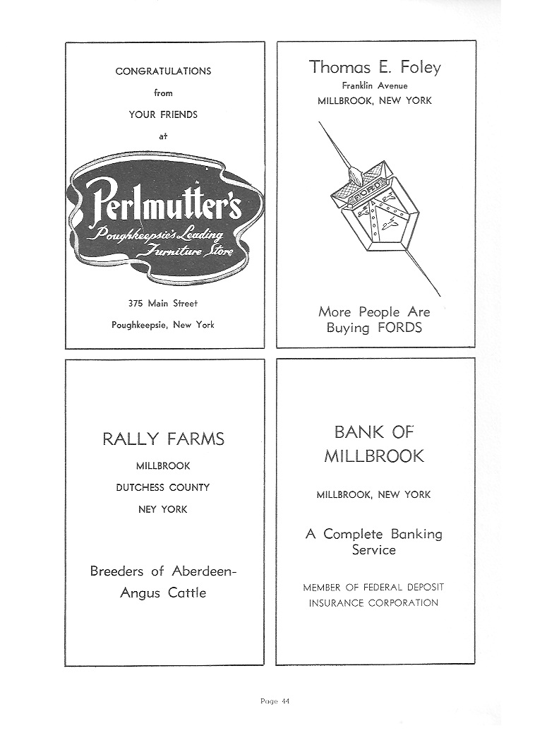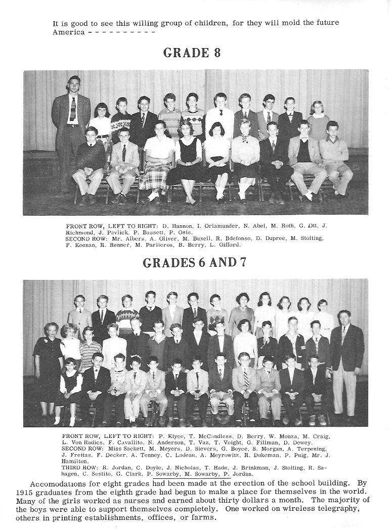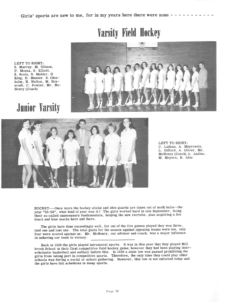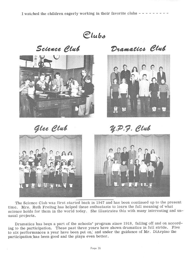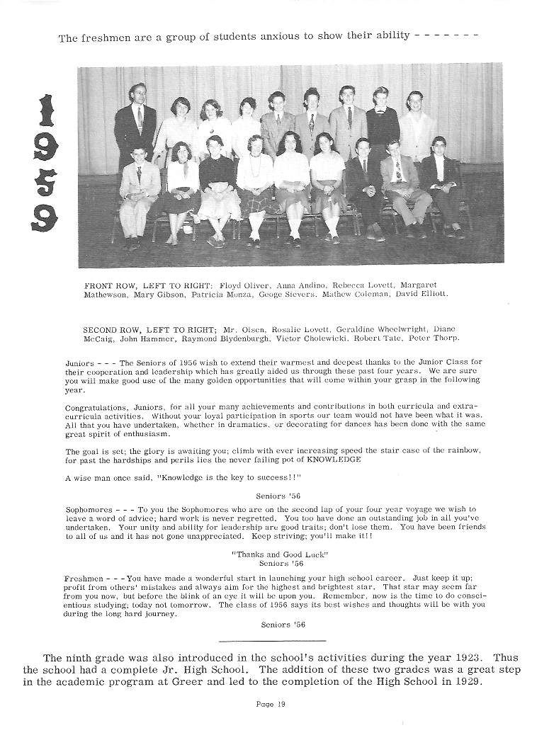 with the 1934 yearbook. The 1956 yearbook is dedicated to Mr. Mapledoram Fink and has an appreciation to Mr. George Groh - the 1934 book had no appreciation but was dedicated to Mr. Frederick Behrends. The 1956 yearbook has pictures of fourteen seniors and a post graduate - the 1934 yearbook had only six senior pictures. (continued) |