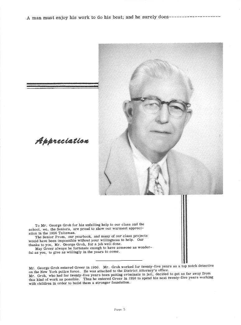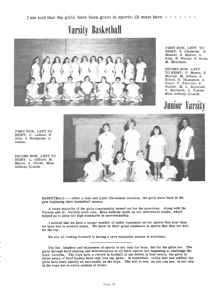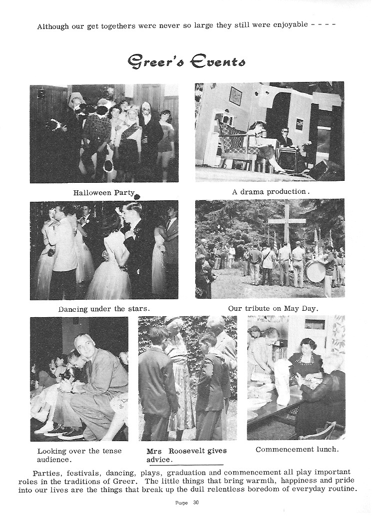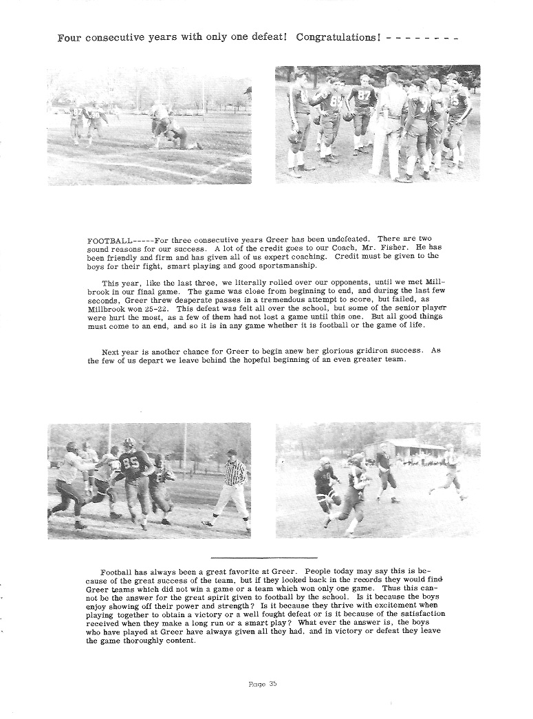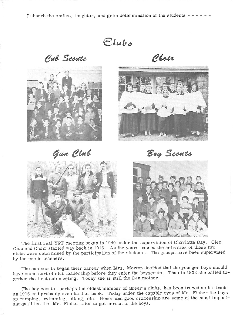 the background and teaching have helped students to make good in future jobs. Listed here are just a few of the many occupations of Greer's alumni: Teaching, banking, secretarial work, pharmacy, nursing, engineering, Governmental services, operating small businesses, factory foremanship, draftsmanship, designing, and salesmanship. |