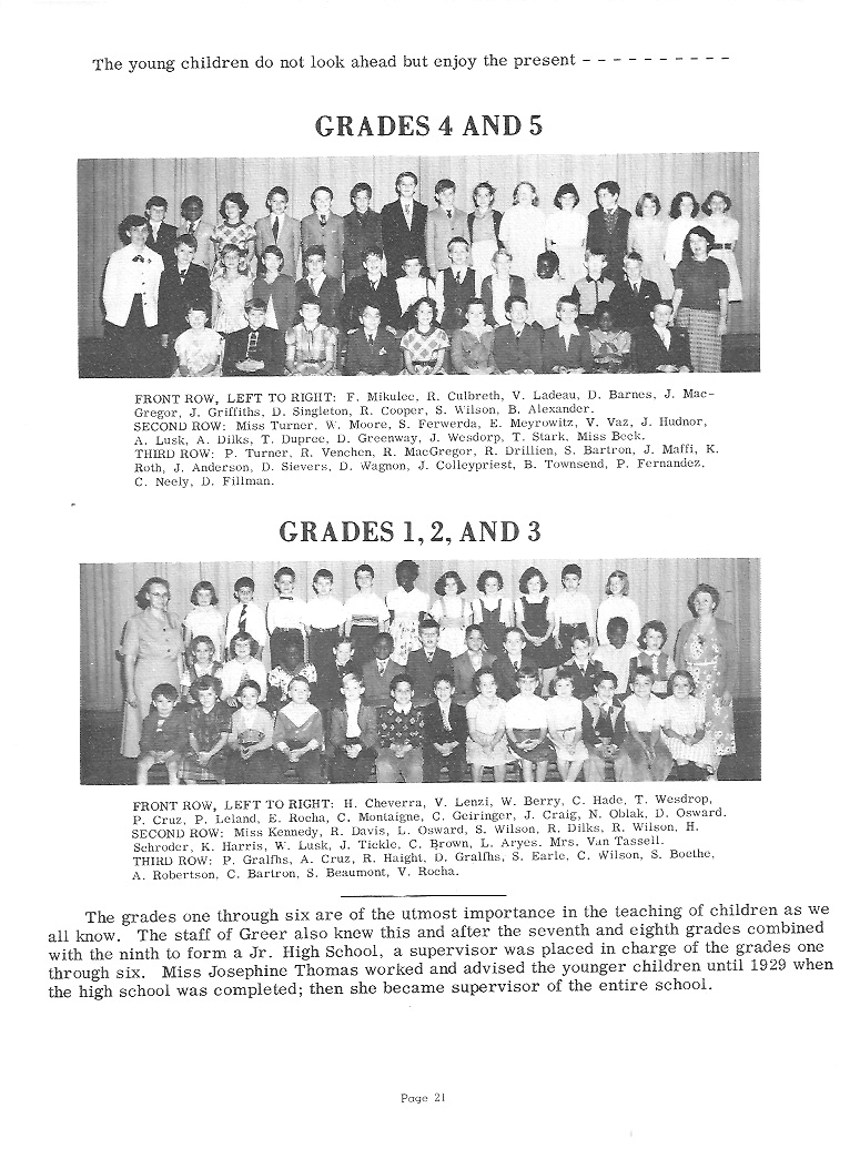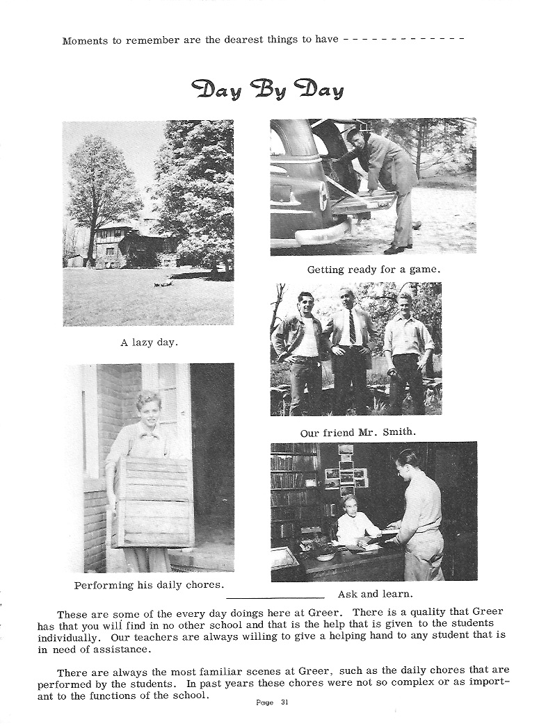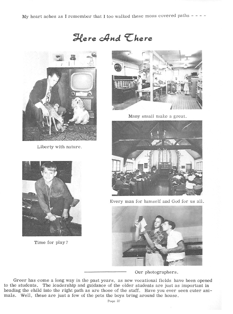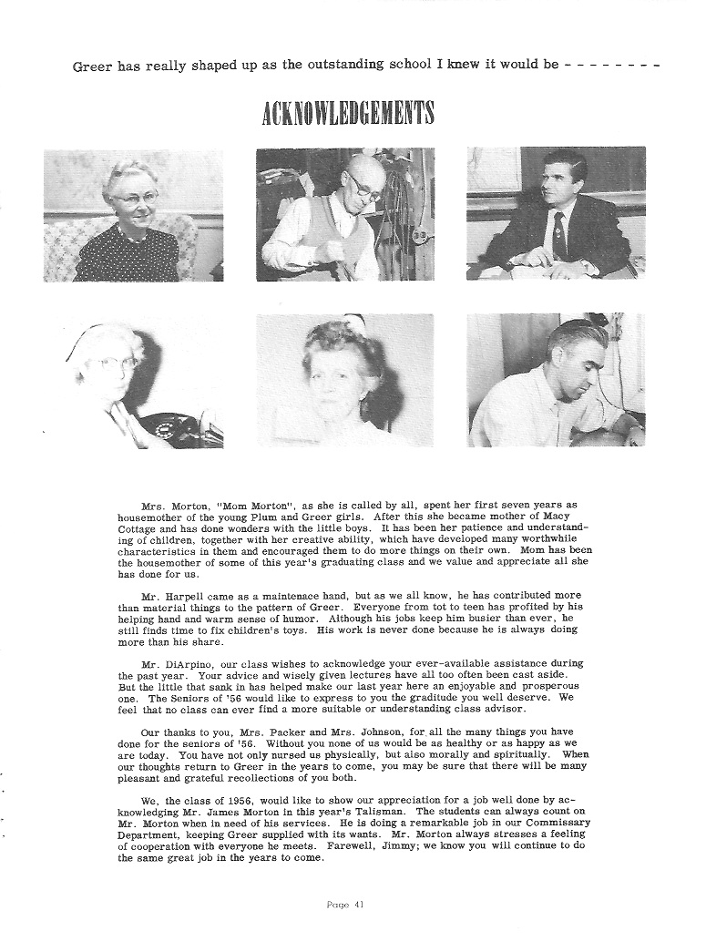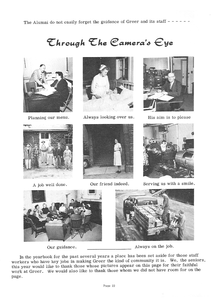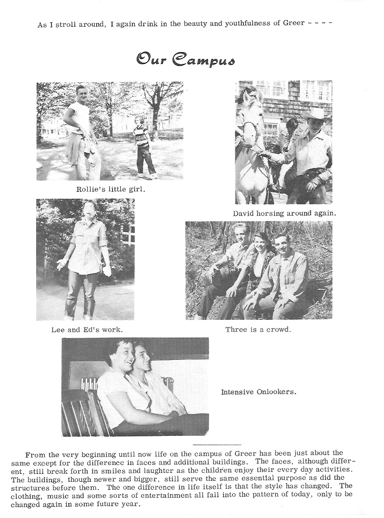 the background and teaching have helped students to make good in future jobs. Listed here are just a few of the many occupations of Greer's alumni: Teaching, banking, secretarial work, pharmacy, nursing, engineering, Governmental services, operating small businesses, factory foremanship, draftsmanship, designing, and salesmanship. |