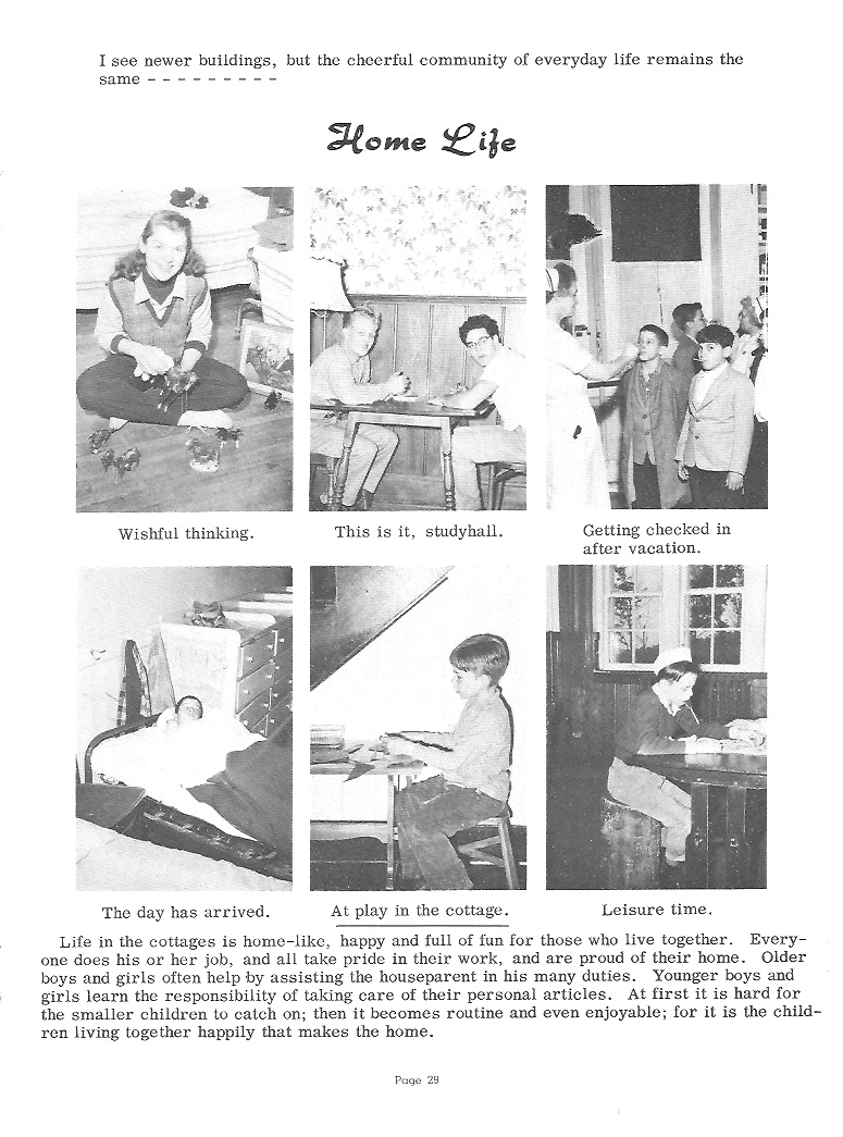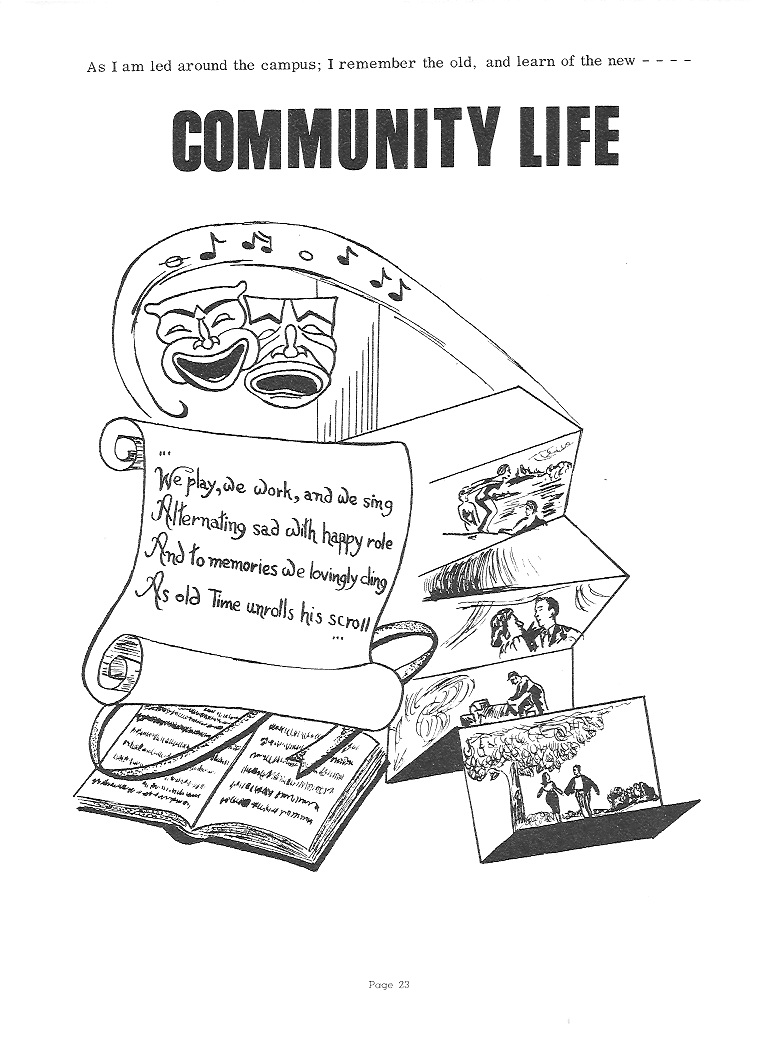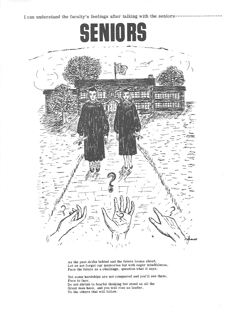 1934 book is found a Class Decision, a Class Will and a prophecy (of members of the class), also a Class Poem. The 1956 yearbook has pictures of faculty, lower classes, a campus shot, sports and other activities. The 1934 had none of these pictures whatsoever. It had only one picture of the school, the six seniors, and a picture of Frederick Behrends. |