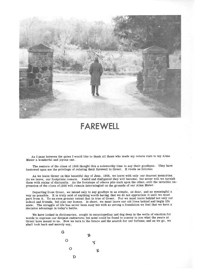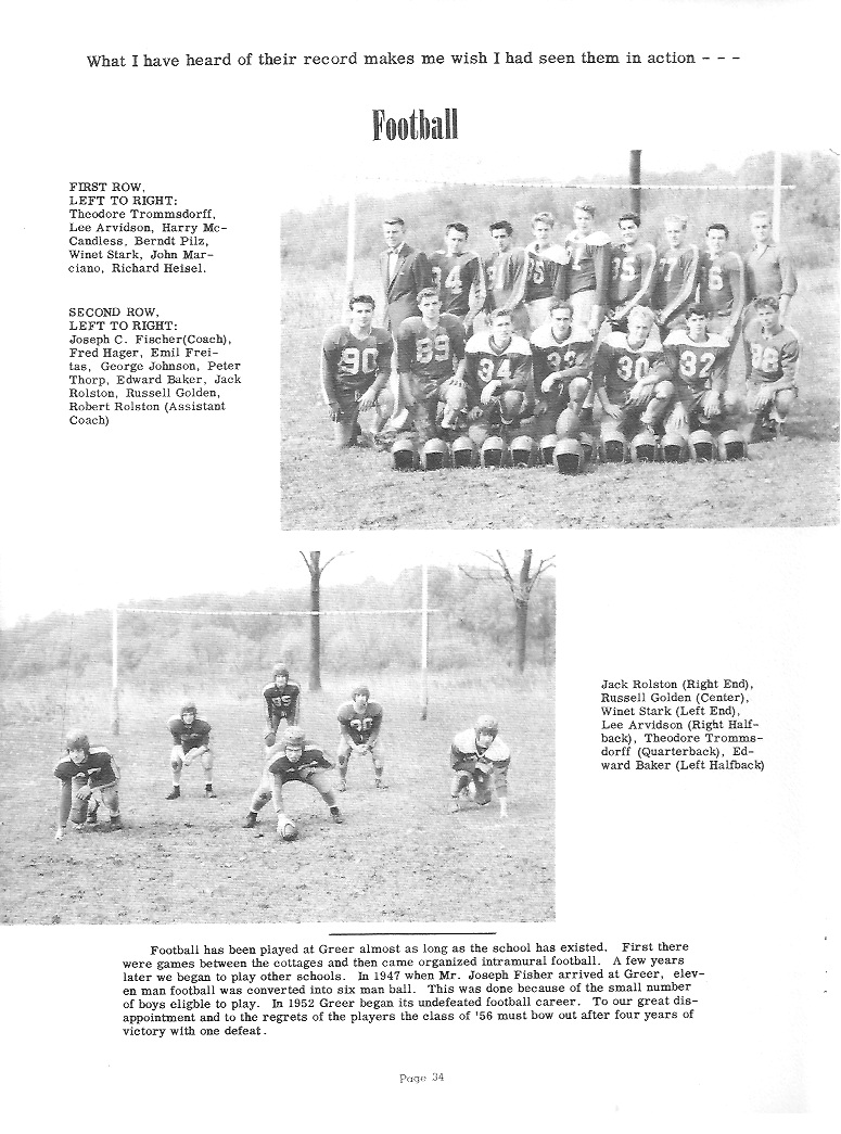 |   | HAROLD LEE ARVIDSON Born: New York, October 7, 19** Entered Greer: January 22, 1944 Basketball 1, 2, 3, 4 Football 1, 2, 3, 4 Baseball 1, 2, 3, 4 Rifle Club 4 Yearbook 4 Dramatics 2, 3, 4, President 3 Martin Play 3, 4 Y.P.F. 2 Brian Morton Award 2, 3 Herbert Bender Loyalty Award 3 Ambition: Acting |