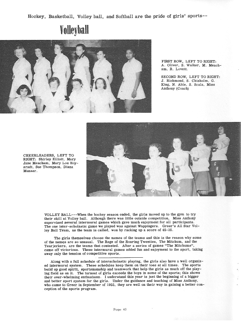 | MARY LOU HOYSRADT Born: Sharon, Connecticut, October 7, 19** Entered Greer: October 29, 1949 Basketball 1, 2, 3, 4 Hockey 1, 2, 3, 4 Softball 1, 2, 3, 4 Cheerleading 4 Volleyball 2, 3, 4 Choir 1, 2 Modern Dance 1 G.A.A. 3, 4, Secretary 3, 4 Class Secretary 1, 2 Yearbook 4 Ambition: Private Secretary |   |