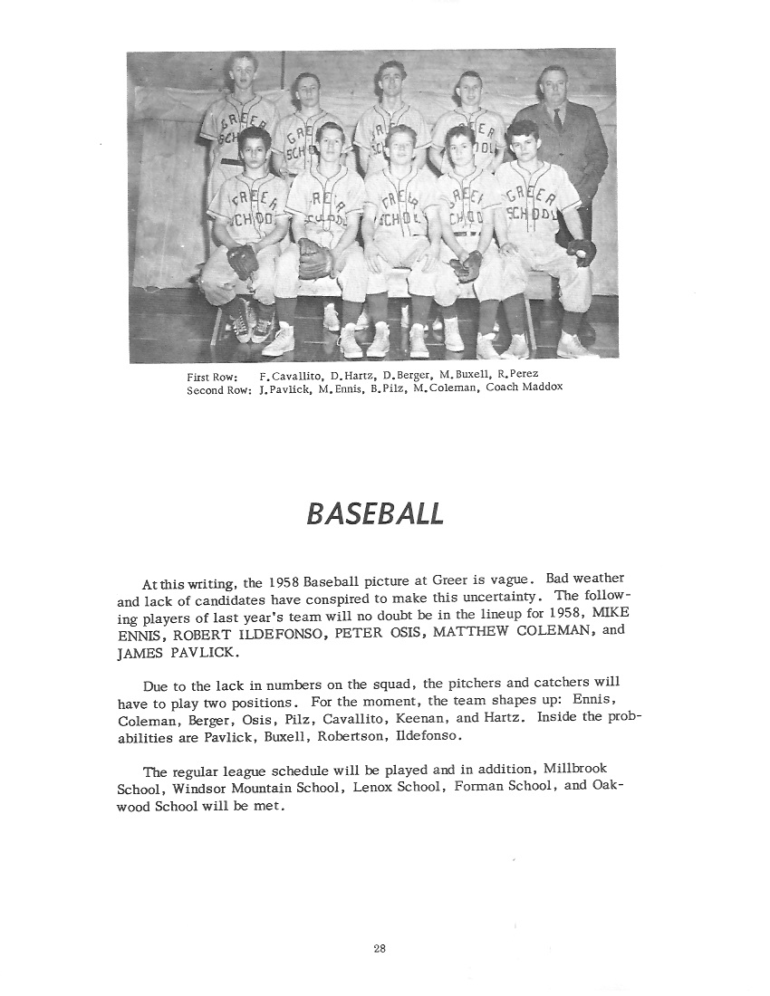 MICHAEL NEIL ENNIS Born: Jamaica, New York, March 15, 19** Entered Greer: November 27, 1948 Football: 3, 4 - Captain Basketball: 1, 2, 3, 4 - Captain Baseball: 1, 2, 3, 4 President: 4 Treasurer: 3 Dramatics: 4 Hunting Club: 3, 4 Sportsmanship Award: 3 Albrecht Award: 4 Nickname: Little Man Ambition: Physical Education Instructor |