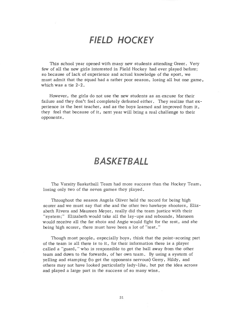 JUSTINE MURRAY Born: New York, September 28, 19** Entered Greer: September 12, 1948 Basketball: 1, 2, 3, 4 Softball: 1, 2, 3, 4 Volleyball: 1, 2, 3 Hockey 1, 2, 4 G.A.A.: 1, 2, 3, 4 Cheerleading: 1, 2, 3 Choir: 4 Glee Club: 4 Science Club: 1, 2 Cottage Award: 1 Albrecht Award: 4 Nickname: Suzie Ambition: To be a teacher. |